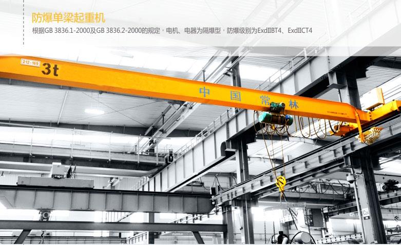 QB型防爆橋式起重機所有的電動機、電器防爆使用性能滿足GB3836.2-2000《爆炸性氣體環境用防爆電氣設備第二部分:隔爆型“d”》、整個設備使用性能滿足JB/T5897-2006《防爆橋式起重機》標準規范,經我國特定的防爆設備產品檢驗工作單位產品檢驗合同協議,獲得了《防爆合格證》。防爆標志各自為ExdⅡCT4。本設備比較適用于工廠內傳爆水平不高過ⅡB或ⅡC級,燃燒工作溫度組別為T1-T4組的可燃性氣體或蒸氣與室內空氣產生爆炸性氣體混合物質的場合,比較適用于危險性范圍為1區和2區(GB3836.1-2000)。